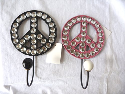 Set of 2 peace sign design towel hooks. Approximately 5.5" diameter and 8.5" tall with hook. Keyhole on the back for sturdy mounting. Metal - One pink and one black. New
